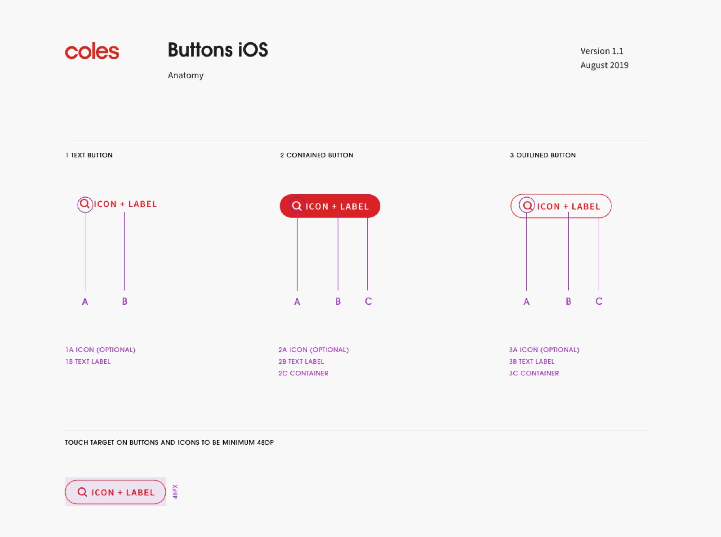 On the technology front, off-the-shelf solutions were inadequate for Coles Group’s complex needs. I led the decision to build a custom backend that managed design updates, compiled code, and centralized system hosting. To promote adoption and scalability, I also championed the creation of a public-facing documentation website, complete with components, templates, code samples, and usage guidelines.